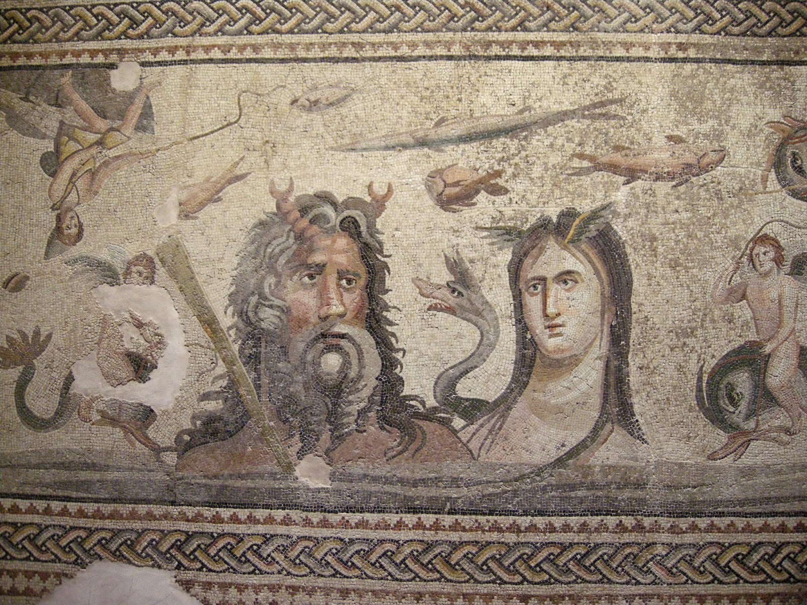 Above, a mosaic of the river god Oceanos and his wife Tethys who are encircled by sea creatures.