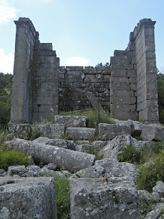 The door columns of the pronaos of the in antis building are angled in situ (pictured above), while the right corner member of the cornice lay atop the crumbled pile in front of the temple (pictured below).