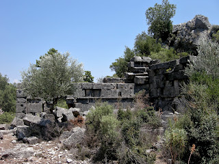 Based on a nearby inscription in Lycian on a rock face (pictured in the left of the photo below) and flanked by steps near the second largest temple located closest to the natural hill that reads, 'Ertemi', or 'Artemis', that would suggest that this is the temple of Artemis, and also Apollo if we consider the significance of the mosaic.