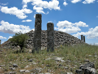 So, I took the plunge into the opening, but I can tell you, I didn't stay there long! Pictured below, the tomb entrance with the northwest columnar in the right of the photo, and the tumulus at the left.
